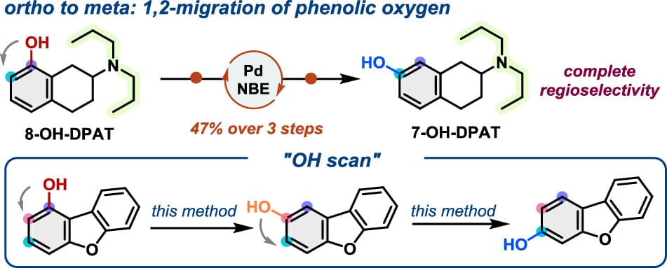 The authors report a palladium/norbornene cooperative catalysis-enabled 1,2-oxygen transposition on arenes. This method shows complete regioselectivity and tolerates substrates with various electronic properties and substitution patterns. While ortho-substituted substrates work best, preliminary success with ortho-unsubstituted phenols has been achieved, leading to an interesting “OH-scan” across three contiguous positions. Furthermore, late-stage 1,2-transposition of phenolic oxygen in three pharmaceutically relevant compounds was successfully demonstrated.