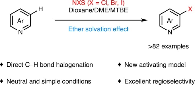The authors describe a general direct regioselective C-3 halogenation of pyridines promoted by an ether solvation effect. This radical process enables the regioselective reaction to occur at the C-3 position of pyridines, rather than other aromatic C–H bonds, and can be applied to the late-stage halogenation of complex molecules.