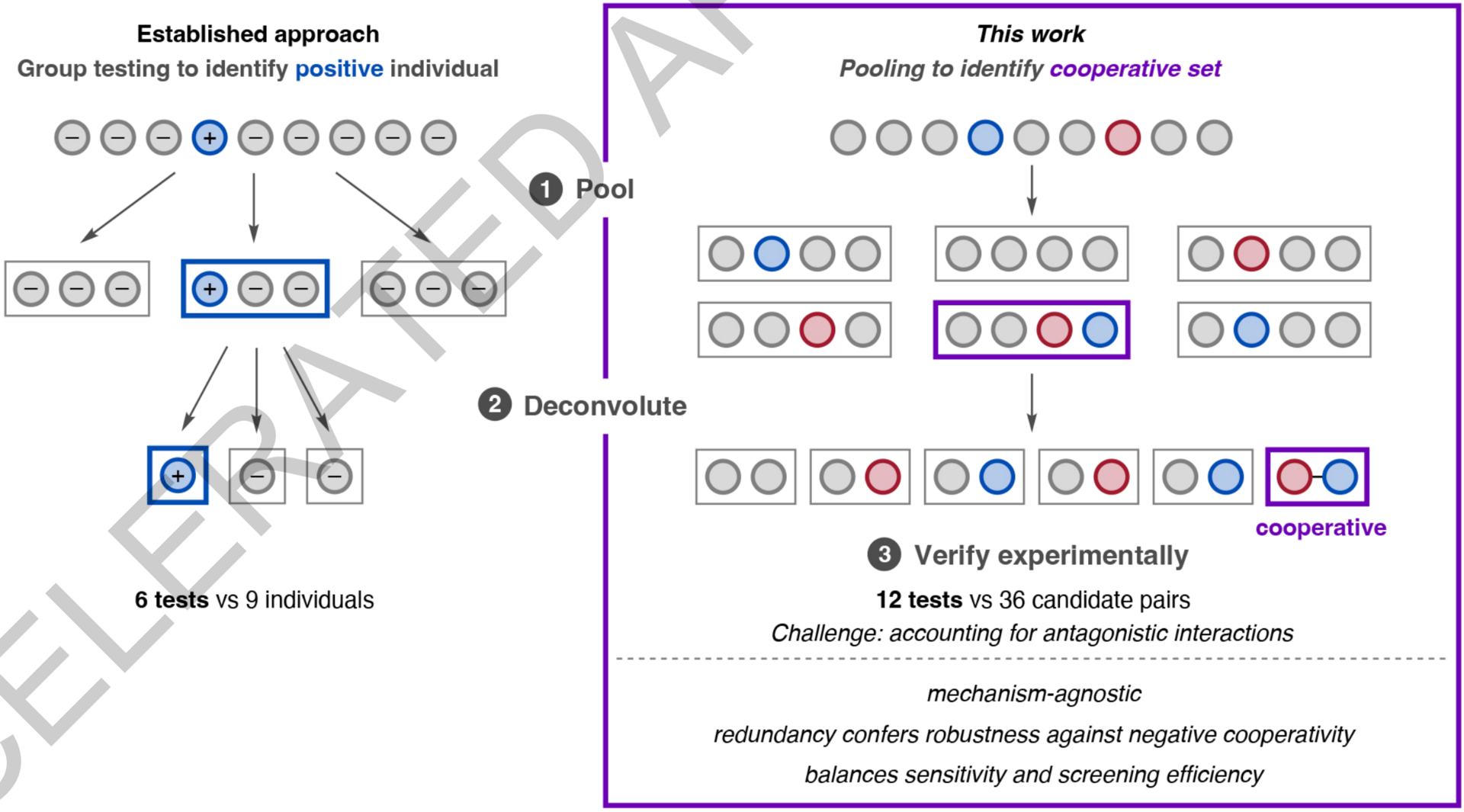 The authors describe a pooling–deconvolution algorithm, inspired by group testing, that identifies cooperative catalyst behaviors with low experimental cost while accommodating potential inhibitory effects between catalyst candidates. The workflow was validated first on simulated cooperativity data, and then by experimentally identifying previously documented cooperativity between organocatalysts in an enantioselective oxetane-opening reaction. The workflow was then applied in a discovery context to a Pd-catalyzed decarbonylative cross-coupling reaction, enabling the identification of several ligand pairs that promote the target transformation at substantially lower catalyst loading and temperature than previously reported with single ligand systems.