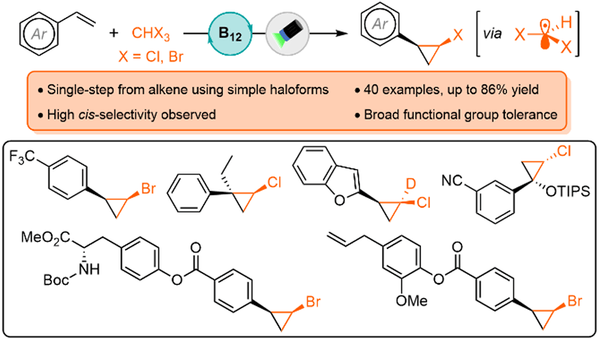 The authors report a Vitamin B12-photocatalyzed approach for the direct synthesis of 1,2-disubstituted halocyclopropanes starting from alkenes and simple haloforms under visible-light irradiation. This method yields a diverse range of 1,2-disubstituted halocyclopropanes with high cis-selectivity, providing efficient access to these traditionally difficult to prepare stereoisomers.
