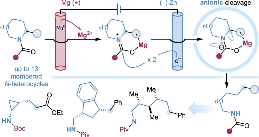 The authors report an electroreductive strategy for ring-opening C–N bond cleavage of saturated N-carbonyl heterocycles to access linear amides. This method enables heterolytic ring opening across a broad range of unstrained cyclic amines, including pyrrolidines, piperidines, azepines, azocanes, and N-macrocycles. Broad compatibility with diverse N-carbonyl protecting groups and functional groups is demonstrated, and the procedure is readily scalable and amenable to high-throughput experimentation. The synthetic utility of the method is demonstrated through the preparation of decorated, stereodefined linear amides from complex cyclic precursors.