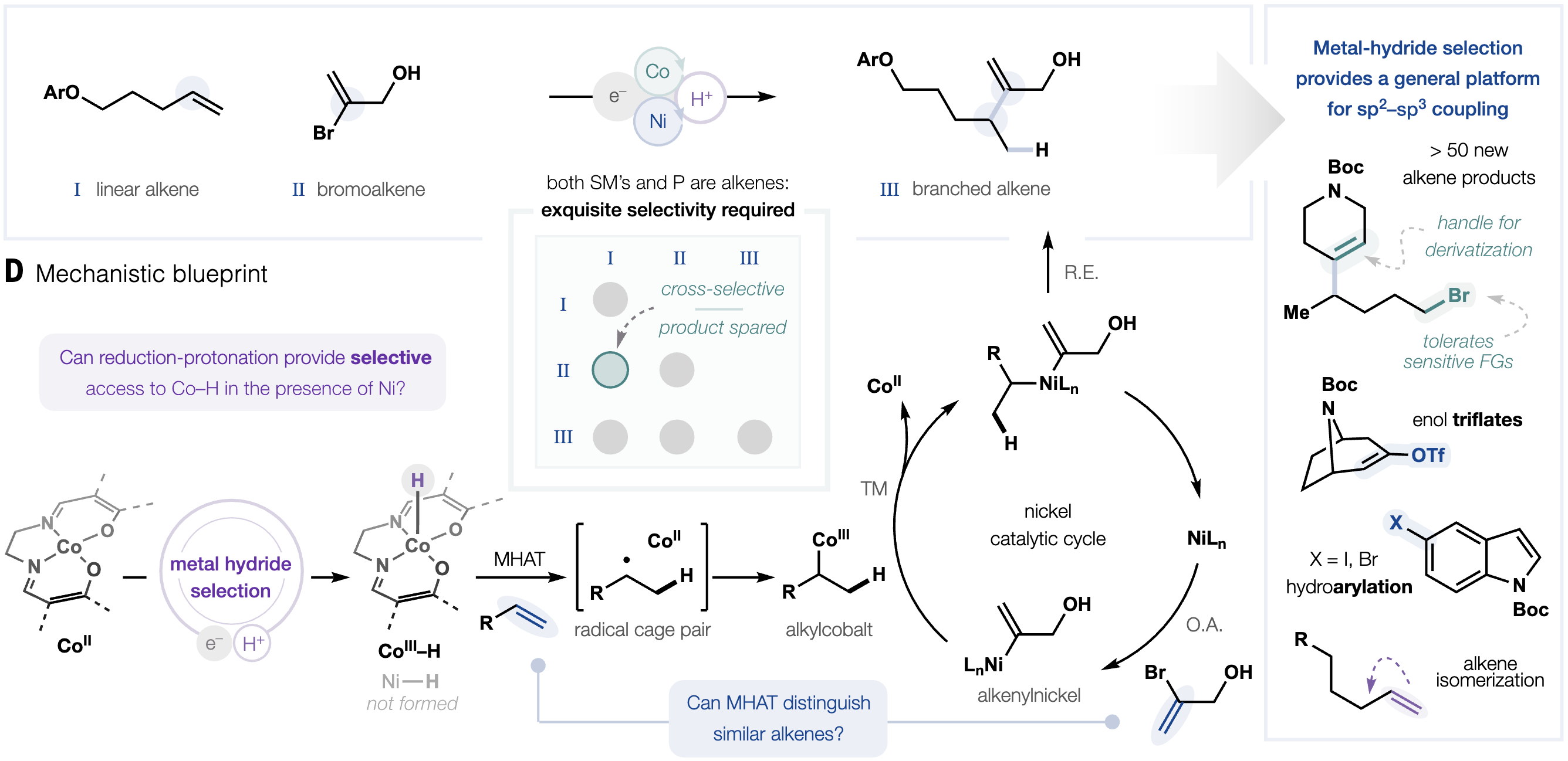 Controlled placement of branch points along carbon chains is essential in the synthesis of materials, agrochemicals and pharmaceuticals. Metal hydride hydrogen atom transfer (MHAT) to alkenes enables direct access to branched products from abundant α-olefins and can be merged with transition-metal catalysis to override inherent linear selectivity. However, poor discrimination of hydridic reagents between catalysts often generates multiple metal hydrides, leading to diminished selectivity. Here, the authors introduce a “metal hydride selection” strategy in which a lutidinium acid/manganese system selectively forms cobalt hydrides in the presence of nickel. This enables a cross- and branched-selective hydroalkenylation of alkenes, delivering valuable branched products with high selectivity.