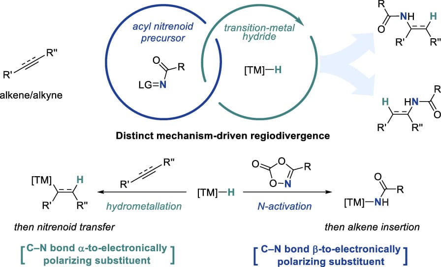 Transition-metal hydride (TMH) catalysis is a powerful approach for hydroamination, enabling C–N bond formation from alkenes and alkynes under mild conditions. Conventional TMH pathways involve hydrometalation, which directs regioselectivity to electronically activated sites. This Account describes the combination of TMH catalysis with nitrenoid transfer, revealing two mechanistically distinct hydroamidation regimes dictated by step order. Using dioxazolones as nitrenoid precursors, a canonical pathway was established in which hydrometalation precedes nitrenoid transfer, enabling predictable regioselective hydroamidation. In contrast, NiH catalysis can initiate by nitrenoid activation, forming a Ni-amido intermediate that engages the alkene, shifting selectivity control to C–N bond formation and enabling otherwise inaccessible regioselectivity.