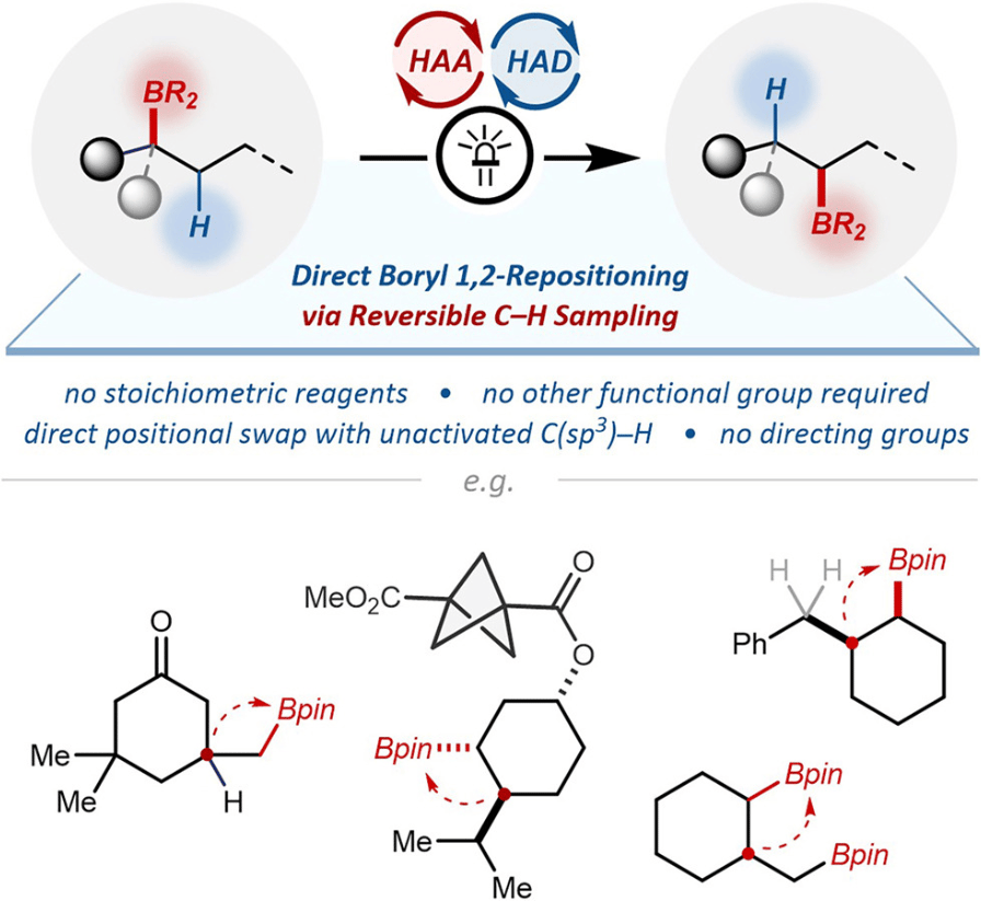 The authors report a direct 1,2-boryl translocation with common C(sp3 )–H bonds in alkyl boronic esters. Driven by the synergy between hydrogen atom abstraction and donation catalysis, this reaction features reversible radical generation at multiple C–H sites yet ensures selective transformation via the kinetically favored 1,2-radical boryl migration. No directing groups or stoichiometric reagents are needed, and the mechanism is supported by both experimental and computational evidence.
