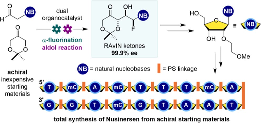 The authors report a streamlined platform for producing nucleoside analogues (NAs) to expand access to precision-edited oligonucleotide therapeutics (ONTs). The method employs achiral starting materials and a dual organocatalyst, one-pot process to generate RAvIN (rapid access to value-added innovative nucleosides) ketones (RKs), a key class of ONT building blocks. These intermediates incorporate protected natural nucleobases or analogues, can be synthesized on scale in 2–4 steps with high enantiomeric purity, and are readily diversified to access next-generation NAs with improved pharmacokinetic properties. The versatility of the approach is demonstrated through a fully noncarbohydrate synthesis of the all-MOE-modified 18mer ONT Nusinersen.
