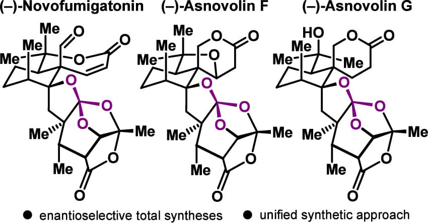 The authors report a full account of the total synthesis of (−)-novofumigatonin and the first syntheses of (−)-asnovolin F and (−)-asnovolin G. The strategy for these 3,5-dimethylorsellinic acid (DMOA)-derived spiromeroterpenoid ortholactones relies on two key elements: convergent coupling of fragments of comparable complexity and subsequent construction of the embedded ortholactone cages. An advanced intermediate containing the ortholactone–acetal core enables access to all three natural products.
