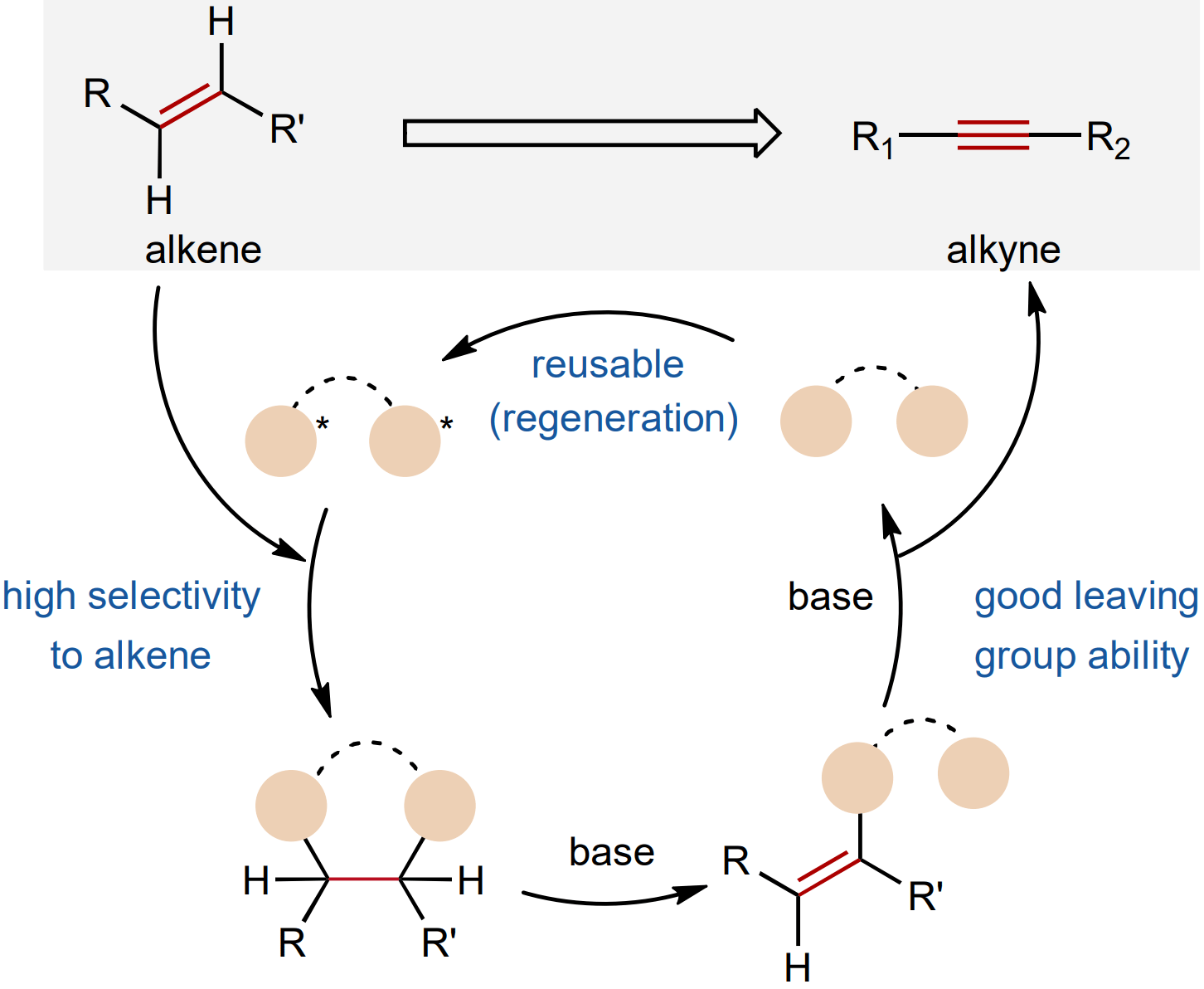 The authors report a recyclable selenanthrene reagent that enables the mild desaturation of alkenes to alkynes. The method exhibits broad compatibility with both classical leaving groups and sensitive functional groups, facilitating late-stage application in the synthesis of complex alkynes. Additionally, the platform allows Z/E alkene configuration inversion or sorting, which is not accessible using existing methods.