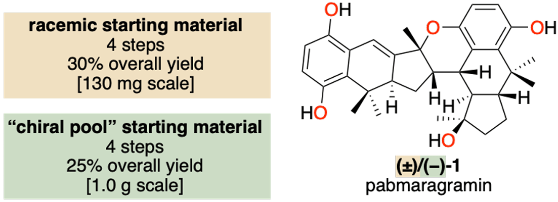 Natural products are a vital source of bioactive compounds, with activity governed by their three-dimensional structure and absolute configuration. While enzymatic biosynthesis typically affords enantiopure products and nonenzymatic pathways yield racemates, scalemic natural products challenge this dichotomy. One such example is pabmaragramin, a metabolite of Marasmius graminum isolated in a 65:35 enantiomeric ratio. Here, the authors report a four-step total synthesis of pabmaragramin, enabling access to both racemic and enantioenriched material. The route features a biomimetic cascade incorporating a Diels–Alder dimerization with inherent homochiral selectivity; computational studies provide insight into the origins of this rare selectivity.