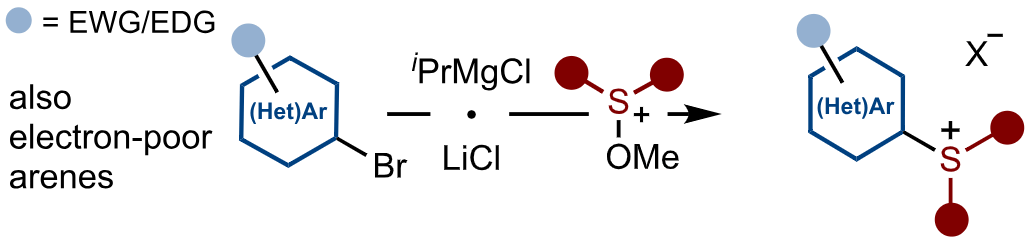 Hard-to-access (hetero)aryl sulfonium salts are prepared using stable methoxysulfonium salts in combination with the magnesiation of (hetero)aryl bromides. The approach allows access to aryl sulfonium salts bearing electron-deficient (hetero)aryl rings, or electron-rich aryl motifs in which the sulfonium motif resides at an alternative position on the ring to that delivered by electrophilic sulfenylation. The new sulfonium salts extend the scope of photocatalytic, photochemical, and ligand-coupling processes.