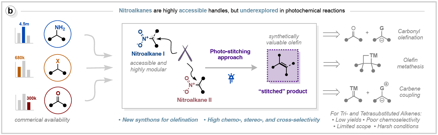 Stereodefined tri- and tetrasubstituted alkenes remain challenging to access because most olefination methods favor lower substitution and fail under sterically congested conditions. Here, the authors describe a photoinduced cross-denitrative olefination of nitroalkanes to afford tri- and tetrasubstituted alkenes. Visible-light excitation of in situ–generated nitronates promotes a photo-stitching event that couples and denitrates two nitroalkanes. The transformation exhibits broad functional-group tolerance, complements metathesis and carbonyl olefination, and scales efficiently.