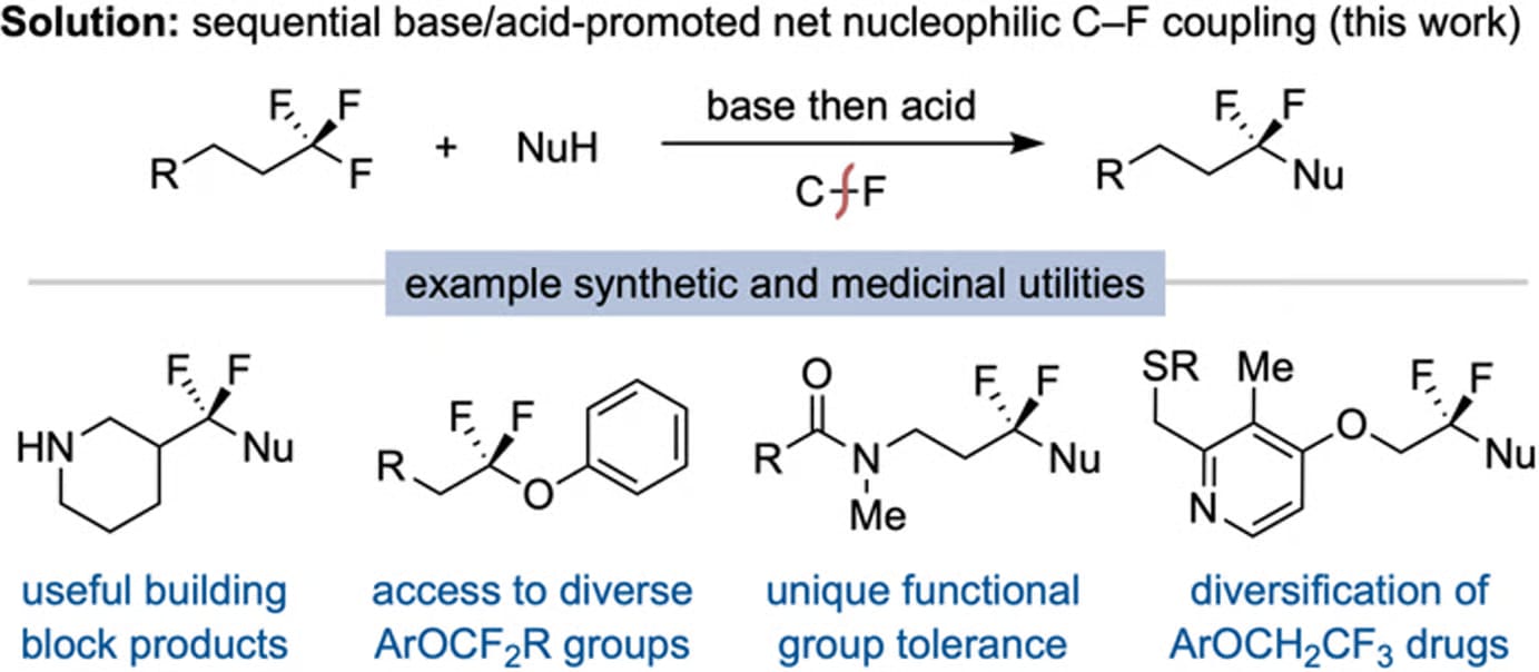The authors disclose a method for the net coupling of nucleophiles with a single C–F bond of unactivated (trifluoromethyl)alkanes. The process proceeds through a base-promoted dehydrofluorination/defluorinative nucleophilic addition cascade to form vinyl fluoride intermediates, which undergo rapid hydrofluorination to yield gem-difluorinated products, thereby transforming aliphatic CF3 groups in commercial building blocks and medicinal compounds into diverse α,α-difluoro(thio)ether motifs.