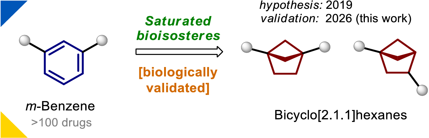 In 2019, the authors hypothesised that bicyclo[2.1.1]hexanes could serve as bioisosteres of ortho- and meta-substituted benzenes. This concept was experimentally validated for ortho-benzenes in 2020, establishing bicyclo[2.1.1]hexanes as key motifs in the emerging field of saturated benzene bioisosteres. Here, the authors provide experimental validation of the remaining hypothesis, demonstrating that bicyclo[2.1.1]hexanes can also mimic meta-benzenes.