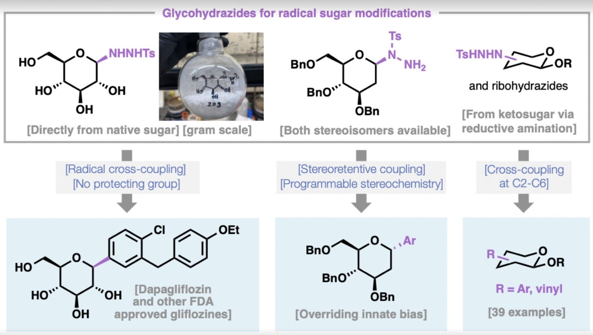 A practical approach to C-aryl glycosides using glycosyl sulfonyl hydrazides as redox-neutral radical precursors for cross-coupling is described. Prepared directly from unprotected native sugars, these reagents generate glycosyl radicals under mild conditions and enable efficient access to diverse C-aryl glycosides, including all approved SGLT2 inhibitors (e.g., dapagliflozin, canagliflozin and empagliflozin), as well as natural products including salmochelins and neopetrosins. Beyond anomeric functionalization, this platform enables C–C bond formation at multiple positions on carbohydrate scaffolds and supports stereoretentive radical coupling that can override inherent stereochemical biases.