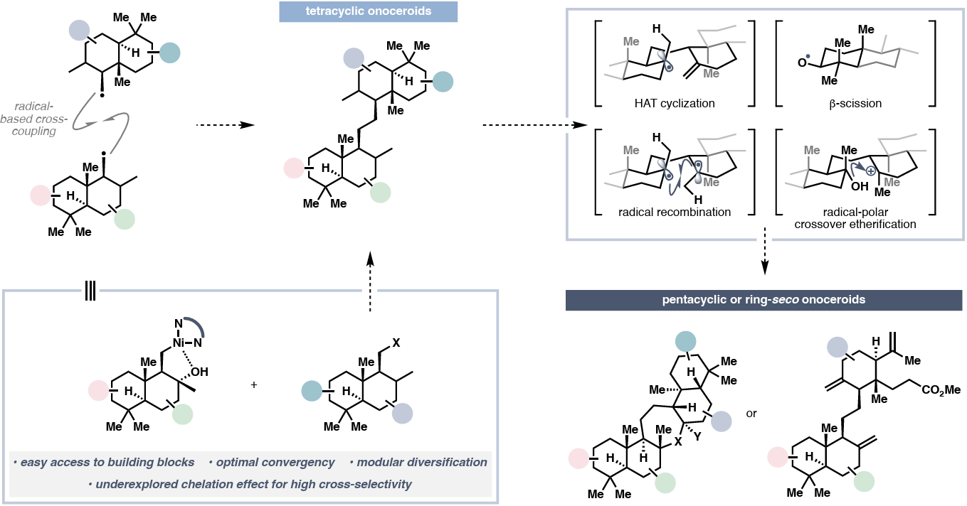 Onoceroids are complex triterpenoids that often possess unsymmetrical pseudodimeric structures, presenting a significant synthetic challenge. Here, a family-level solution to the synthesis of all known onoceroid skeleton subtypes is described. A key feature is the discovery of a chelation effect that enables high cross-selectivity in radical C(sp3 )–C(sp3 ) coupling between two closely related fragments. Combined with other modern radical reactions, this strategy enables rapid access to more than 20 naturally occurring onoceroids.