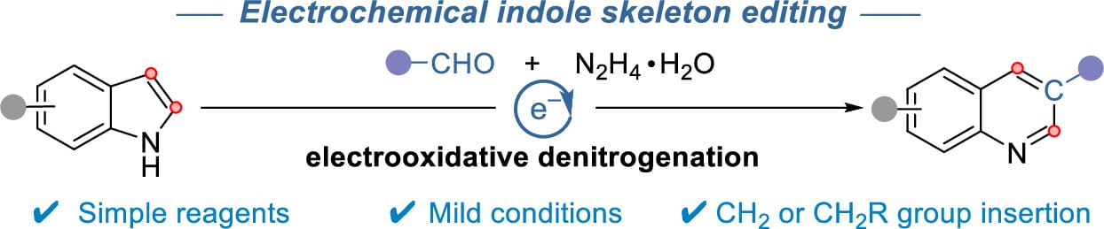 The authors report an electrochemical single-carbon insertion strategy for the skeletal editing of indoles into quinolines, which proceeds without the need for specialized reagents or transition-metal catalysts. The reaction is proposed to proceed via an electrooxidative denitrogenation process, in which in situ formed hydrazones generate reactive carbene intermediates that promote ring expansion.
