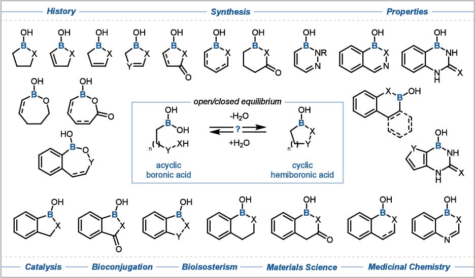 Cyclic hemiboronic acids are boron-containing heterocycles with one exocyclic boranol (B–OH) group, one endocyclic B–C bond, and one endocyclic B–heteroatom (O or N) bond. Unlike the more explored boronic acids, these compounds have gained interest due to the success of benzoxaboroles in drug discovery, highlighted by the approval of tavaborole and crisaborole. Over the past two decades, interest in nonaromatic and pseudoaromatic hemiboronic heterocycles has grown, with applications in organocatalysis, bioconjugation, drug discovery, natural product synthesis, and dynamic materials. This article reviews these compounds, discussing preparative methods, structural characteristics, and properties like open-closed equilibrium, acidity, and molecular interactions. Ring size and heteroatom type significantly affect acidity, reactivity, and aromatic character, influencing their applications.