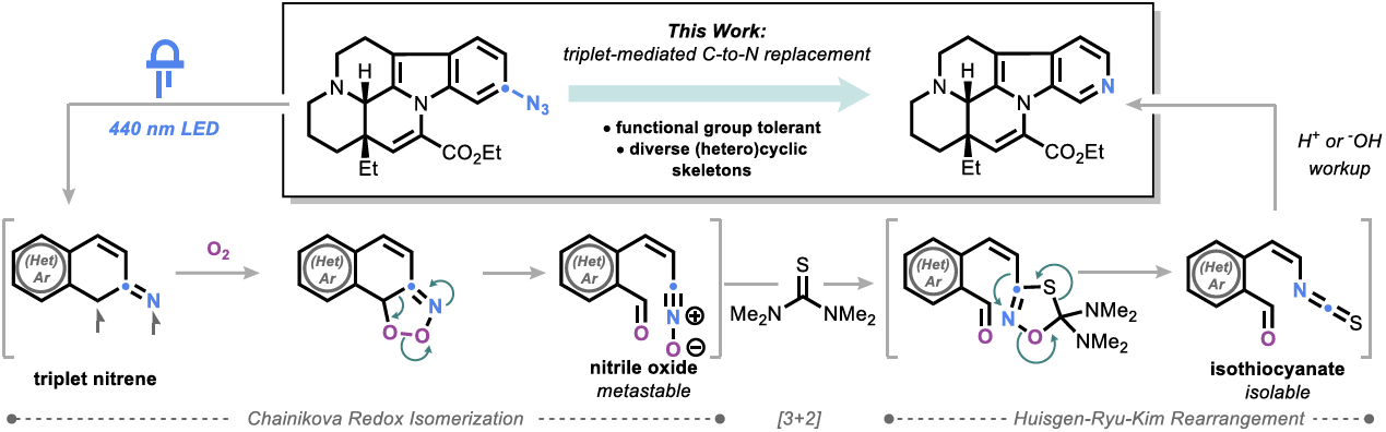 Despite significant proof-of-concept advances, aromatic C-to-N replacement reactions remain limitingly substrate-specific and exhibit an overreliance on harsh oxidation methods that preclude their deployment in demanding contexts. Transformations relying on singlet nitrene valence insertion, in particular, have suffered from parasitic intersystem crossing to the triplet spin state, which does not undergo the same rearrangement. Here, the authors report a reaction that productively engages triplet aryl nitrenes for C-to-N replacement with broad scope under mild conditions, enabling its application to complex, sensitive natural products.