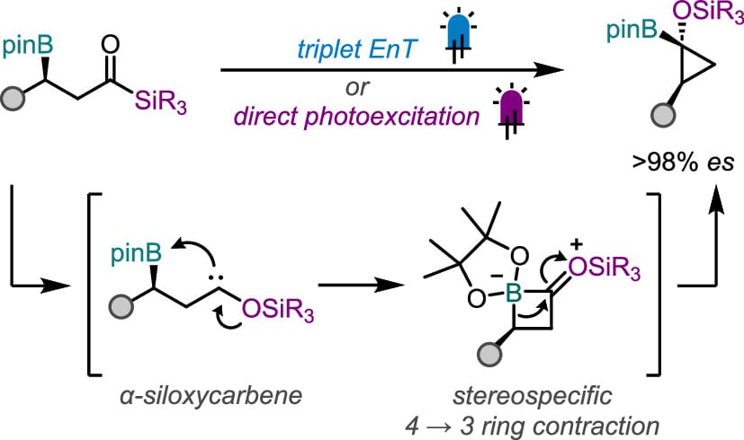 The authors present the synthesis of enantioenriched 1,1-siloxycyclopropylboronic esters from photoexcited β-boryl acylsilanes using a ring-contractive 1,2-boronate rearrangement strategy. Triplet energy transfer catalysis is effective in triggering the desired cyclization via α-siloxycarbene formation; however, an unexpected stereoablative energy transfer process was observed and investigated. An alternative approach using direct photoexcitation was thereby developed and enabled stereochemical information to be relayed with complete fidelity through the transformation. The functional utility of 1,1-siloxycyclopropylboronic esters is demonstrated through a series of orthogonal transformations at the oxygen and boronic ester handles.