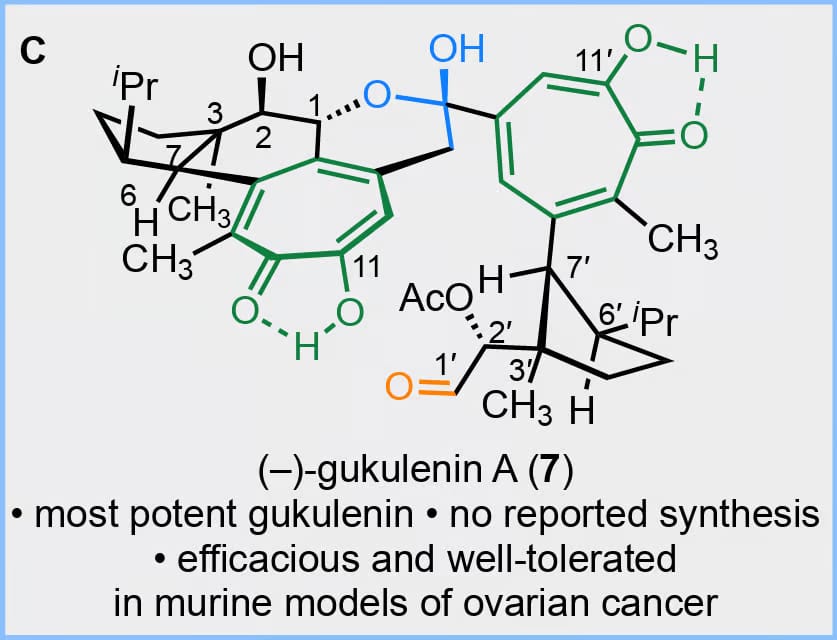 Among secondary metabolites that contain α-tropolones, the pseudodimeric isolate (–)-gukulenin A stands out for its complexity and has shown promise in treating murine models of ovarian cancer. Here, the authors describe an enantioselective synthesis of (–)-gukulenin A. Key steps include a directed C–H arylation, a tandem Grob fragmentation-alkylation, an innovative synthesis of methyl tropolone ethers, a multicomponent cross-coupling, and a thermal carbonyl-ene reaction. Structure-function studies establish the dimeric tropolone and aldehyde substructures as drivers of cytotoxicity.