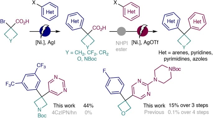 The pursuit of increasingly complex, three-dimensional molecules is pushing the boundaries of modern organic synthesis, particularly in drug discovery where rigid, saturated scaffolds such as cyclobutanes, azetidines and oxetanes are in high demand. Here, the authors outline a modular, scalable, chemoselective approach to solve this problem using simple α-bromoacids and aryl halides as intuitive starting materials in a sequential series of nickel-electrocatalytic cross-couplings. The scalability of this sequence is demonstrated, alongside direct applications to known patented structures and a simple user guide is also presented to accelerate adoption of this strategy in medicinal chemistry and related fields.