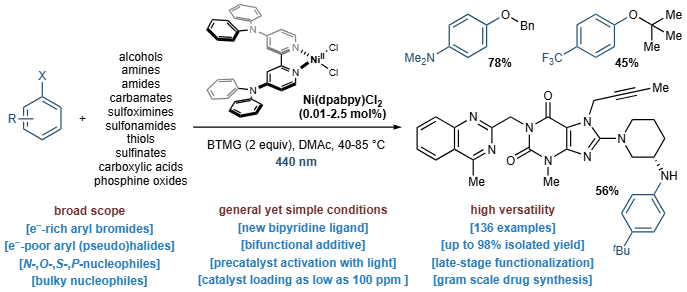 The formation of C(sp2)–heteroatom bonds, crucial for the preparation of pharmaceuticals and agrochemicals, typically occurs via palladium-catalyzed cross-couplings that often require complex ligands. An alternative is using paramagnetic NiI and NiIII species, but this method is limited by the need for activated starting materials and high catalyst loadings due to insufficient catalytic activity and stability of modern NiI catalysts. Here, the authors show that strategic ligand design can overcome these bottlenecks by achieving a balanced equilibrium between a reactive NiI species and a stabilized ligand-centered radical. Use of a non-nucleophilic base additive promotes visible-light generation of NiI from a bench-stable precatalyst. This method allows for coupling a wide range of nucleophiles with aryl halides at low nickel loadings (as low as 100 ppm) and is the first to couple sterically hindered nucleophiles.