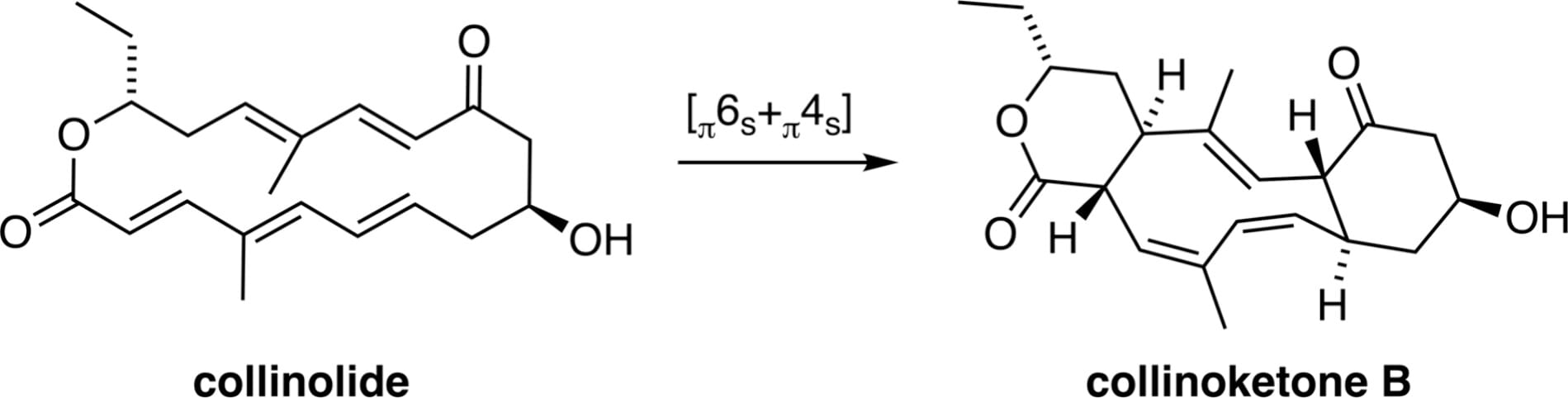 The authors report a short and stereoselective synthesis of a highly unsaturated macrolactone that has been proposed as a biosynthetic precursor of the tricyclic cyclodecatriene collinoketone A and the neuroprotective natural product collinolactone. This macrolactone was found to undergo effective transannular [6+4] cycloadditions to afford stereoisomers of collinoketone A, namely collinoketones B and C. This work reassigns the structure of the natural product reported as collinoketone A and highlights the complexity of [6+4] cycloadditions with conformationally flexible substrates.