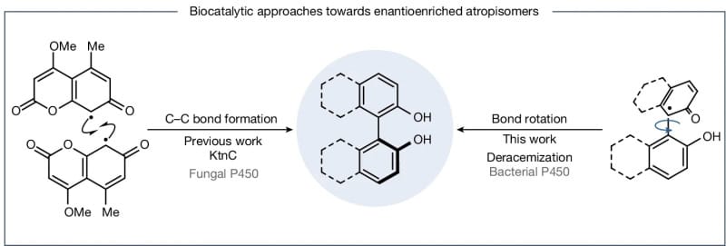 The authors report deracemization activity of a P450 enzyme and explore its ability to deliver a stereoconvergent route towards enantioenriched atropisomers. Using a curated set of P450 variants, a wide variety of symmetric and non-symmetrically substituted 2,2′-binaphthol (BINOL) building blocks could be deracemized with high enantiomeric purity. This deracemization activity is mechanistically distinct from the activity of previously reported P450 enzymes, which operate through enantioselective bond formation to afford enantioenriched atropisomers. By contrast, the deracemization process reported here is proposed to proceed through bond rotation.