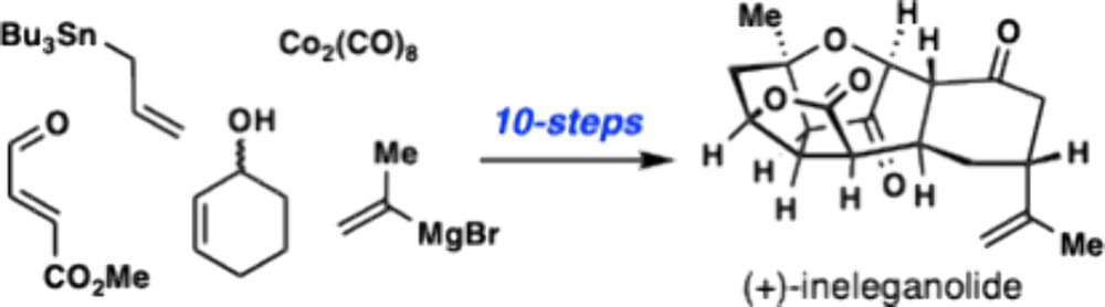 The authors present a 10-step total synthesis of (+)-ineleganolide, a highly oxidized norcembranoid natural product featuring a synthetically challenging caged pentacyclic framework. A trans-selective photochemical [2+2] cycloaddition involving an α,β-unsaturated tricarbonyl chromophore was used to generate a strained cyclobutanol which underwent a CāC bond cleavage cascade when exposed to BrĆønsted acid. Through this sequence, the ineleganolide core polycycle was generated in only six steps from commercially available materials.