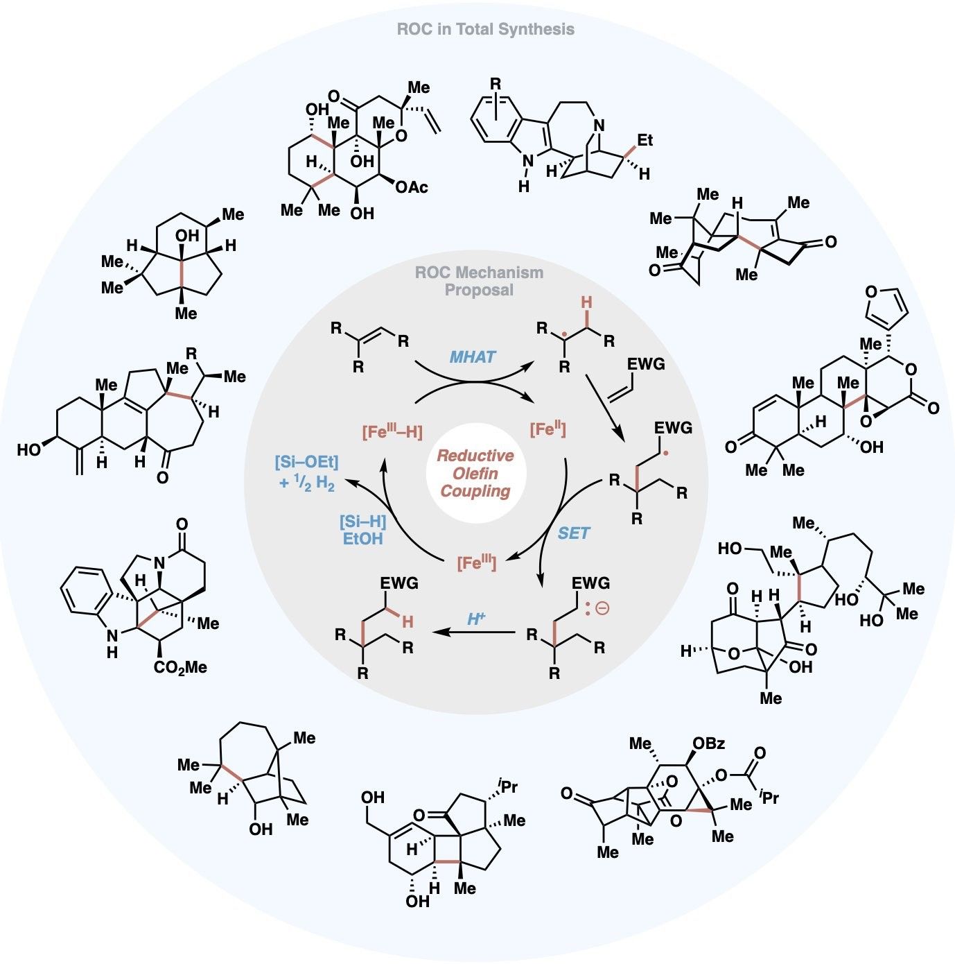 This review highlights iron-catalyzed reductive olefin coupling (ROC)āa versatile metal-hydride hydrogen atom transfer (MHAT)-driven strategy for CāC bond formationāas a key tool in the radical retrosynthesis for natural products. Initiated by the 2014 disclosure of Fe-catalyzed inter- and intramolecular olefināolefin coupling, ROC combines Mukaiyama's hydrofunctionalization with Giese's radical additions. Emphasizing strategic disconnections, the review surveys dozens of total syntheses across terpenoids, alkaloids, and polyketides. The many applications of ROC highlight its power to forge strained rings, quaternary centers, and stereocenters from olefins, often supplanting 2eā tactics. Troubleshooting guides and retrosynthetic blueprints are included to aid future applications in complex molecule assembly.