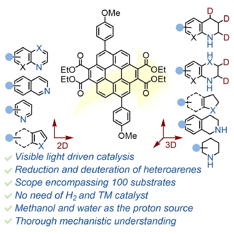 The authors introduce core-extended coronene-tetraesters as organic photoredox catalysts for the photoinduced reduction and deuteration of a range of heteroarenes at ambient temperature using visible light from commercially available LEDs. This protocol accommodates over nine types of heteroarenes under a common reaction condition.