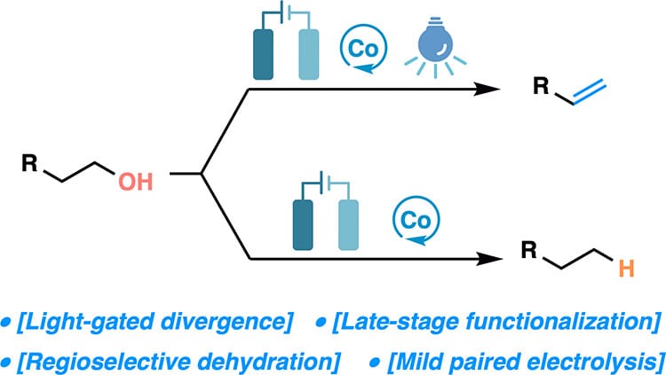 The authors report a cobalt-catalyzed, photoelectrochemical strategy for the direct conversion of primary alcohols to terminal alkenes. The reaction proceeds in an undivided cell under blue-light irradiation, employing a readily available CoCl2/dimethylglyoxime (dmgH2) catalyst system. In contrast, without irradiation, the same conditions yield deoxygenated alkanes. Both methods display broad substrate scope, high regioselectivity across polyol frameworks, and exceptional tolerance of oxidation-sensitive functional groups.