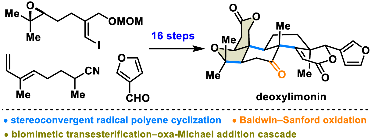 The authors present a concise synthesis of the flagship member of limonoids, deoxylimonin, by a bioinspired skeletal reorganization approach. Key features of this synthesis include a stereoconvergent radical polyene cyclization to assemble the 6/6/6 tricyclic system, an oxime-directed BaldwināSanford oxidation to hydroxylate the unactivated C7āH, a titanium-mediated intermolecular aldol reaction to introduce the 3-furanyl lactone moiety and two contiguous stereogenic centers, and a biomimetic transesterificationāoxa-Michael addition cascade to install the tetrahydrofuran-Ī“-lactone-fused motif.