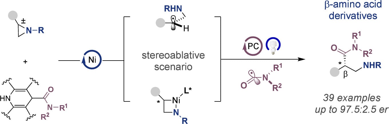 The authors disclose an enantioconvergent carbamoylation of racemic aziridines enabled by a dual catalytic strategy. This method offers a new entry point to highly enantioenriched β-amino amides from simple precursors and is characterized by its broad applicability, even with challenging combinations. Preliminary studies with well-defined nickel complexes support a scenario via carbamoyl organometallic intermediates.