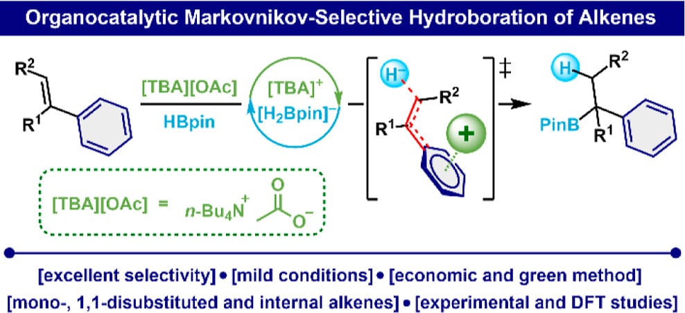 The authors present an organocatalytic method for the Markovnikov-selective hydroboration of aryl alkenes using a readily available quaternary ammonium catalyst. This approach is operationally simple, scalable, and demonstrates broad substrate compatibility. Furthermore, the method enables the efficient synthesis of active pharmaceutical ingredients, including Chlorphenoxamine.