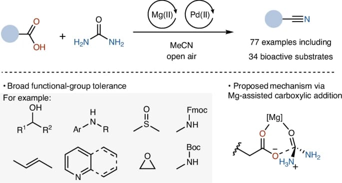 The authors report a mild Mg- and Pd-cocatalysed nitrile synthesis from carboxylic acids with simple, inexpensive urea as the nitrogen source. A pathway involving nucleophilic addition of the carboxylic acid to urea is supported by both mechanistic studies and DFT calculations. The method is effective for the late-stage modification of complex drugs and natural products.