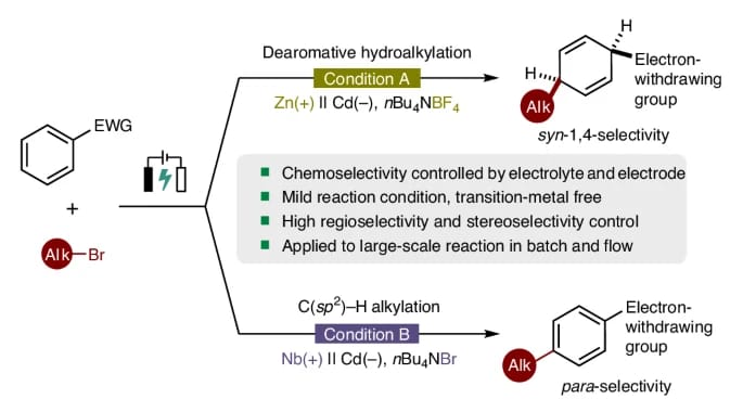 The authors report a dearomative syn-1,4-hydroalkylation reaction of electron-deficient arenes and heteroarenes. This electrochemical approach, conducted under mild, operationally straightforward conditions, facilitates the synthesis of alkylated syn-1,4-cyclohexadienes with high chemoselectivity, regioselectivity and stereoselectivity. In addition, this alkylation protocol is controllable and switchable. By employing a niobium plate as the anode and n-Bu4NBr as the supporting electrolyte, the method enables the para-selective C(sp2)āH alkylation of (hetero)arenes via electrolysis. Both reactions exhibit broad substrate scope and demonstrate excellent compatibility with various electron-deficient arenes and alkyl bromides.