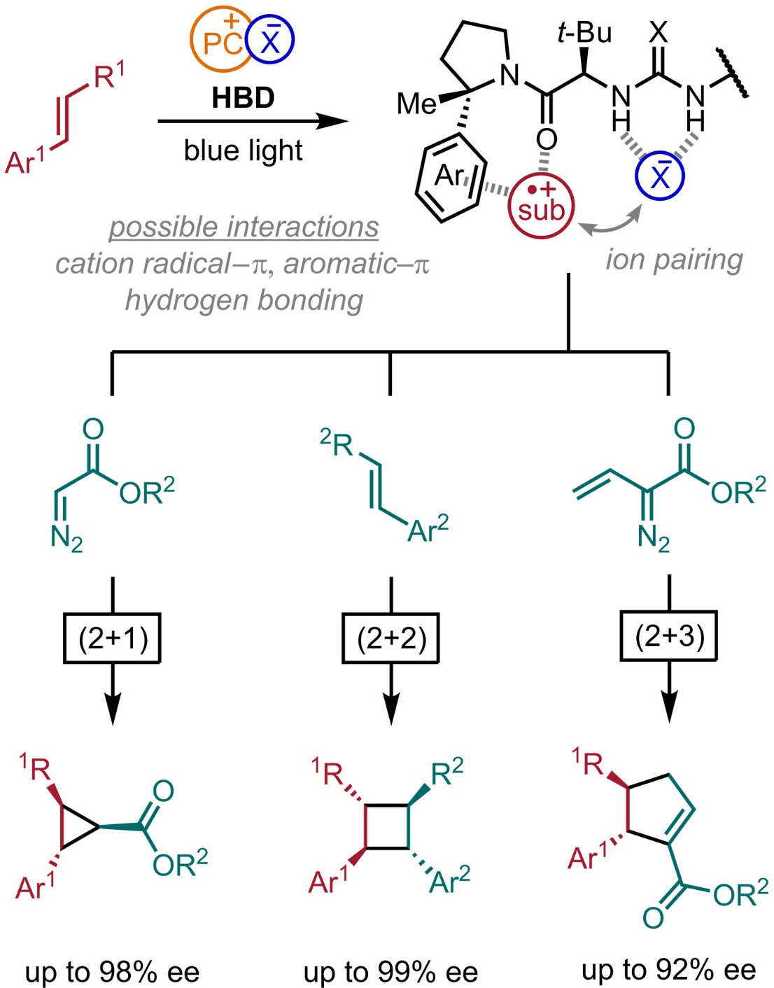 Pairing chiral counteranions with cation radical intermediates provides a potentially generalizable tool for controlling absolute stereochemistry in various reactivity contexts. However, ion-pairing effects on the efficiency of photoinduced processes and the reactivity of radical ion pairs impose severe limits on the chiral anions that can be engaged effectively. In this study, the authors report that association of neutral chiral small-molecule hydrogen-bond donors with the counteranions of cation radical intermediates can achieve enantioselectivity through ion-pairing and other noncovalent interactions. Applications to four different classes of cycloaddition reactions of electron-rich alkene substrates provide cyclic products with up to four new stereocenters in up to 99% enantiomeric excess.