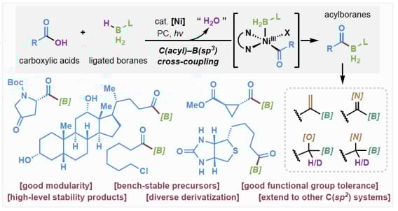 A nickel-catalyzed, radical-based C(acyl)āB cross-coupling strategy has been developed for the efficient synthesis of bench-stable, phosphonite-ligated acylborane compounds from readily available carboxylic acids. This methodology not only provides access to acylboranes with diverse reactivity profiles but also establishes a versatile platform for the direct construction of stabilized organoborane species, which has currently been extended to C(aryl) systems.