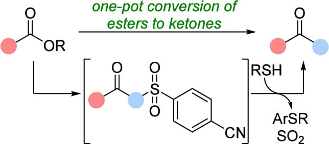 The authors report a general and practical strategy for the conversion of esters to ketones using electron-deficient aryl sulfones. This method is operationally simple, proceeds under mild conditions, and enables the conversion of both aryl and enolizable alkyl esters to alkyl ketones in good to excellent yields. Electrophilic trapping of the β-ketosulfone intermediates enables access to a variety of ketones from a single precursor.