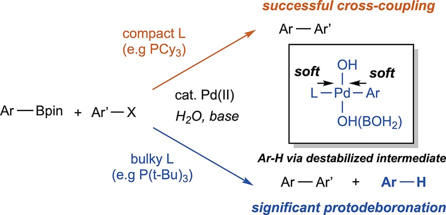 The SuzukiāMiyaura cross-coupling reaction is plagued by protodeboronation, an undesirable side reaction with water that consumes boronic acid derivatives. Mechanistic studies have established protodeboronation to be sensitive to the nature of the boronic reagent, the reaction conditions, and in particular, the presence of bases. However, protodeboronation catalyzed by palladium-phosphine complexes is less studied. Here, the authors report that protodeboronation is accelerated by palladium(II) complexes bound to bulky phosphine ligands. While sterically hindered ligands are used to facilitate difficult cross-couplings, these ligands can instead paradoxically impede cross-coupling product formation.