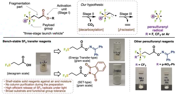 The authors have developed a general pentafluorosulfanylation platform that employs bench-stable solid reagents to generate SF5 radicals via a decarboxylation and β-scission sequence. This strategy enables a variety of operationally simple transformations, expanding the accessibility of SF5-containing molecules. Notably, this reagent design is also adaptable to other persulfuranyl groups, such as trifluoromethyl tetrafluorosulfanyl and aryl tetrafluorosulfanyl groups.