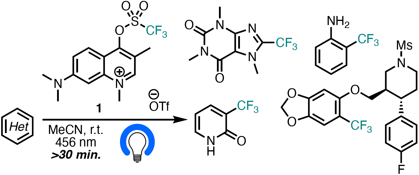 The authors report a simple radical aromatic trifluoromethylation process that utilizes a cationic, aromatic sulfonate ester as a trifluoromethyl radical photocage. This chemistry allows for the rapid and straightforward trifluoromethylation of diverse aromatics and heterocycles, including complex pharmaceuticals and natural products, with only substrate, photocage, solvent, and 456 nm light in minutes.