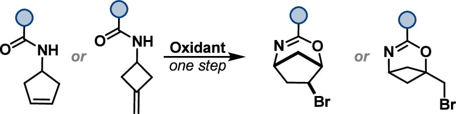 The authors report a scalable, transannular bromocyclization route to prepare functionalized 2-oxa-4-azabicyclo[3.2.1]oct-3-ene and 2-oxa-4-azabicyclo[3.1.1]hept-3-ene scaffolds from readily accessible alkene building blocks. This method demonstrates broad functional group compatibility and introduces a bromide handle for further diversification of the core.