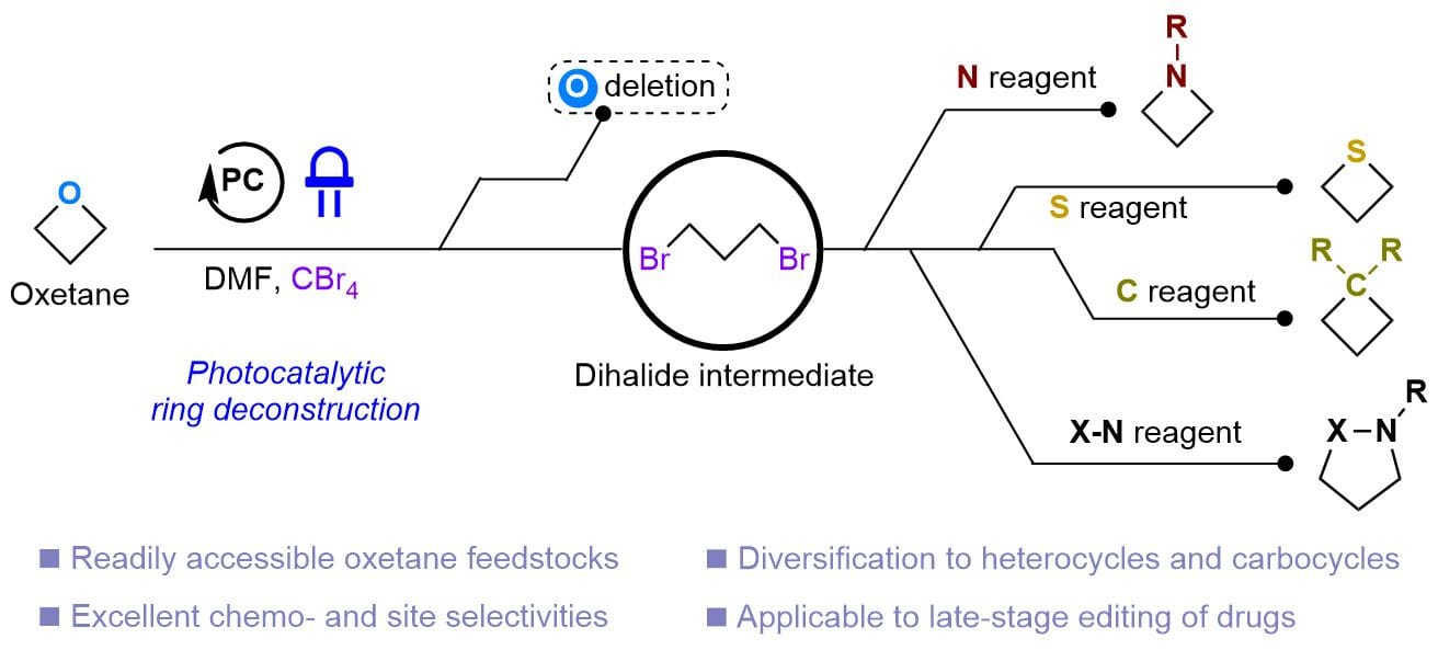 The authors report a general photocatalytic strategy that selectively substitutes the oxygen atom of an oxetane with a nitrogen-, sulfur- or carbon-based moiety, transforming it into a diverse range of saturated cyclic building blocks in a single operation. This atom swapping method exhibits high functional group compatibility and is applicable to late-stage functionalization, substantially simplifying the synthesis of pharmaceuticals and complex drug analogues that would otherwise require multi-step routes.