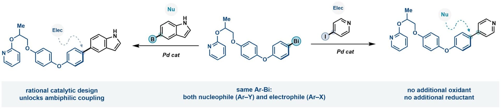 Cross-coupling reactions traditionally permit the formation of ArâAr bonds between an aryl nucleophile and an aryl electrophile under transition metal catalysis. The high selectivity of the myriad of couplings known to date relies on a tailored combination of nucleophilic and electrophilic coupling partners. Here, the authors report ambiphilic aryl-bismuth reagents that can behave as either nucleophiles or electrophiles in transition metalâcatalyzed cross-couplings, fundamentally breaking from this dichotomy in polarity. Their ambiphilic reactivity arises from their ability to engage in both oxidative addition and transmetalation processes with transition metal complexes, as demonstrated by stoichiometric and mechanistic studies.